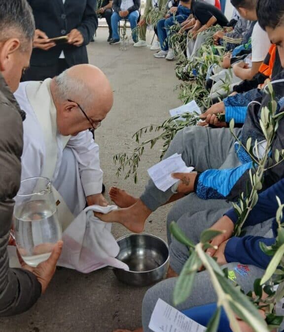 En el marco de la Semana Santa, el Obispo presidió la Eucaristía, y llevó el mensaje de la Semana Santa realizando además los gestos propios de la liturgia de esos días. En ese contexto, bendijo los ramos y repitió el gesto de Jesús en la Última Cena, lavando los pies a varios internos y a personal penitenciario.