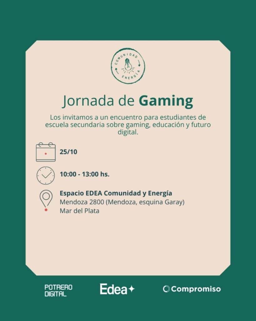 Mar del Plata, 15 de octubre de 2025. A través de la articulación entre Potrero Digital y EDEA, se llevará a cabo un encuentro sobre videojuegos y futuro digital destinado a estudiantes de escuelas secundarias.