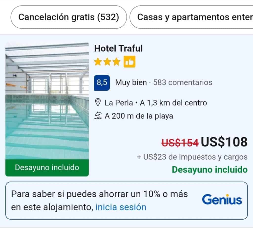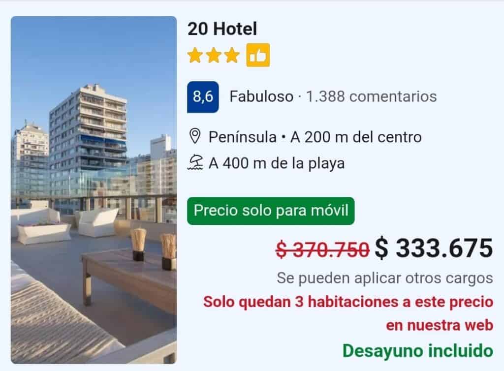 “20 hotel” tiene una tarifa de USD235 ($333.675), aprovechando un descuento por utilizar la app móvil, “Joan Miró hotel” un valor de USD170, ($241.627) “Hotel Florinda” para una habitación doble tiene un valor de USD180 ($255.050) y el hotel “Castilla” cotiza en USD206 ($292.253) Además se especifica que se puede cobrar tarifas extras al momento de finalizar la compra.