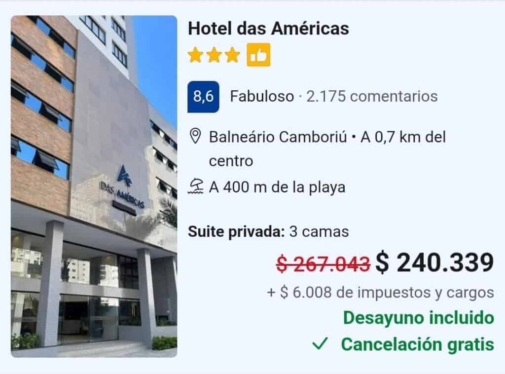 Continuando con los ejemplos, pero en este caso con hoteles 3 estrellas de Camboriú. “Hotel Das Americas” cotiza en el mismo portal de viajes y turismo a USD169 más USD4 de impuestos ($246.347). Otra opción para los turistas es el “Hotel Bella Camboriú” a un valor de USD155 ($225.916). “Santa Inn”, aprovechando una promoción de la web sólo para dispositivos móviles, completa el informe con su tarifa de USD 188 ($266.413).